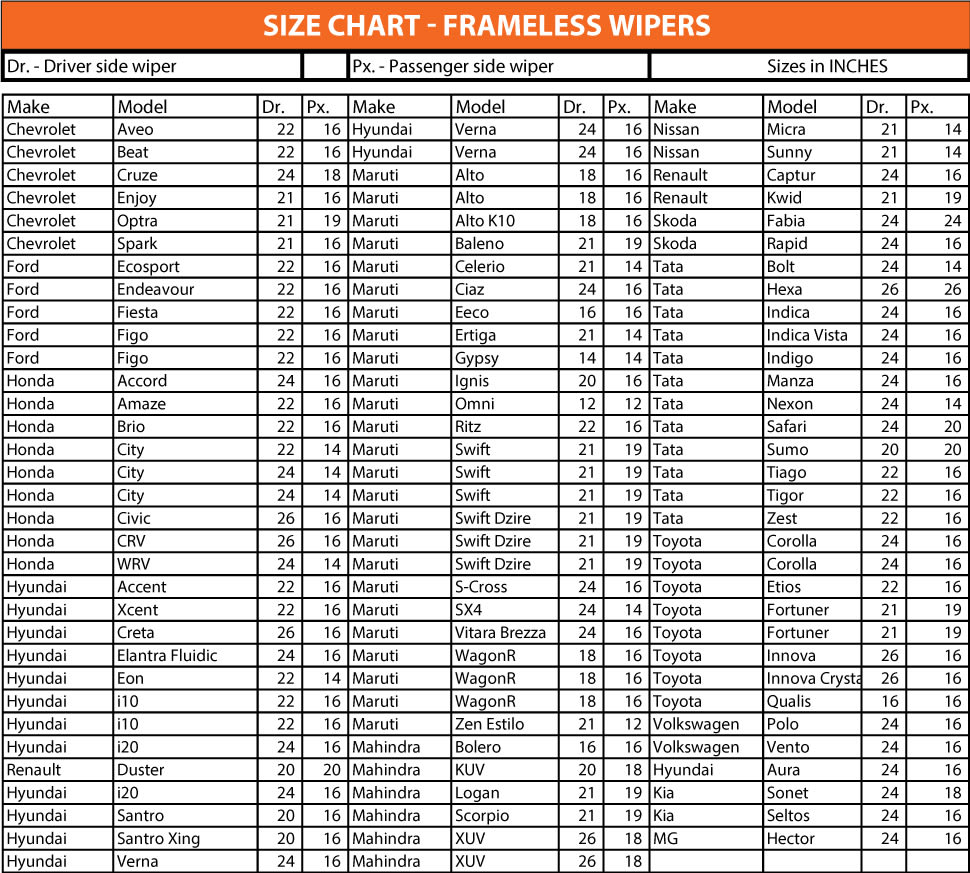 If the blades are longer than required, they will either collide with each other or overlap the windscreen of your car. And if blades are shorter, they will only clean your windscreen partially, which will reduce visibility and safety. Refer to the wiper blade size chart for Indian cars to get the perfect-fit pair of windshield blades for your car. It is displaying car makes/ models along with their respective windscreen sizes.