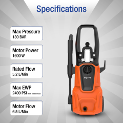 This high-performance car washer is designed to deliver efficient cleaning with a powerful 1600W motor and 130 BAR pressure. Ideal for cleaning vehicles and other outdoor surfaces, it comes equipped with essential attachments to provide a comprehensive cleaning experience.